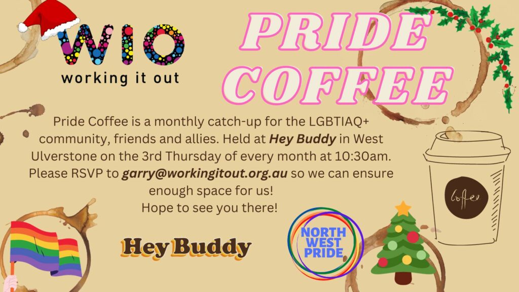 Pride Coffee is a monthly catch-up for the LGBTiAQ+ community, friends and allies. Held at Hey Buddy in West Ulverstone on the 4th Friday of every month at 10:30am.