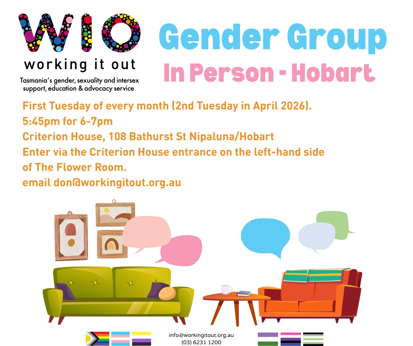 Pride Coffee is a monthly catch-up for the LGBTIQA+ community, friends and allies. Held at McCarthy’s Bread Lounge in Ulverstone on the 4th Tuesday of every month at 10:30am.Facebook Event Link: https://www.facebook.com/share/17474XjoXL Please RSVP to garry@workingitout.org.au so we can ensure enough space for us! Hope to see you there!
