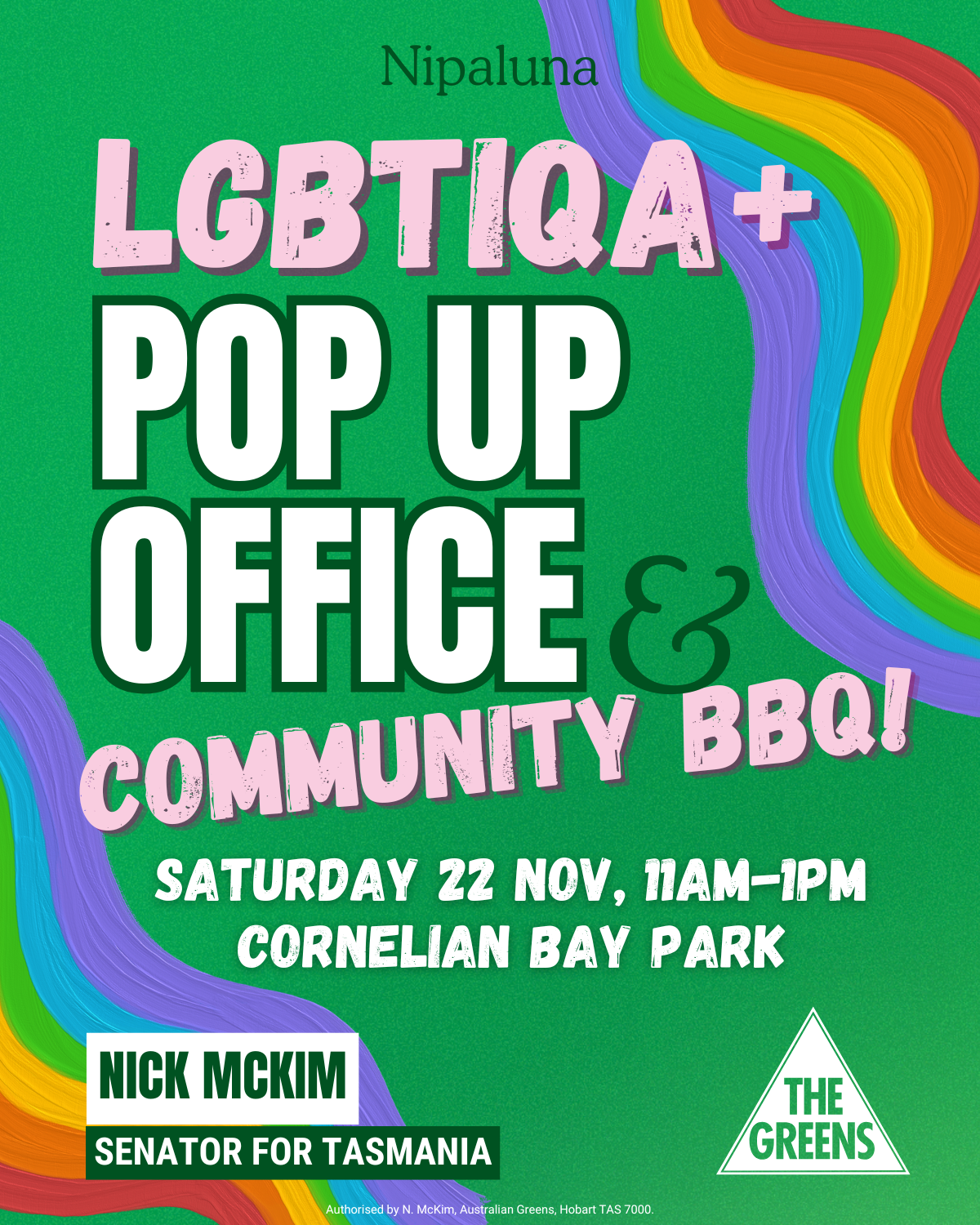 HOBART The Australian Greens Party are holding a LGBTIQA+ Pop Up Office & Free BBQ with Senator Nick McKim, (Australian Greens LGBTIQA+ Spokesperson). They are inviting folks from our LGBTIQA+ community for an informal community catch up and free BBQ at Cornelian Bay Park on Saturday 22 November. Working It Out are not aligned with […] |
