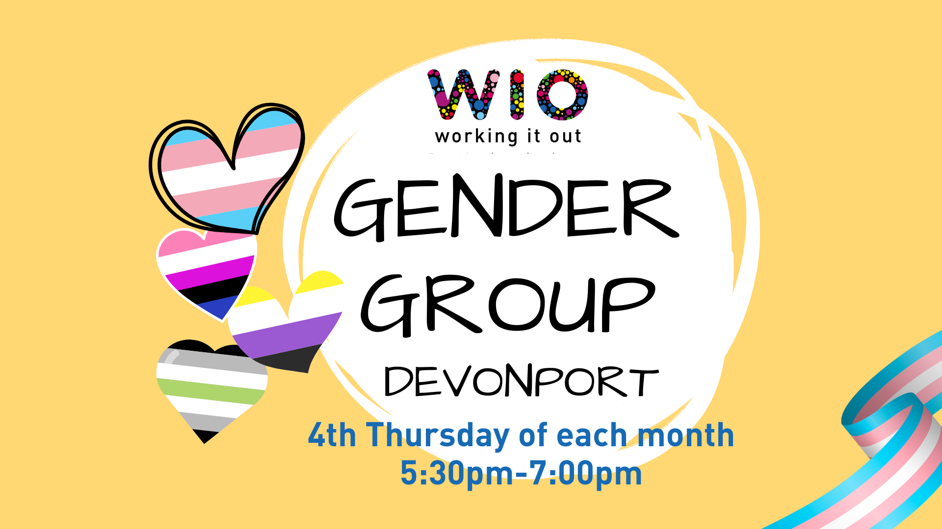 Gender identity peer support and discussion for anyone wanting to connect with others who are trans and gender diverse, or questioning their gender identity. Held in Devonport at the Devonport Library (Upstairs, just look for the pride flags) from 5:30-7:00 pm on the 4th Thursday of each month. If you would like more information or […]